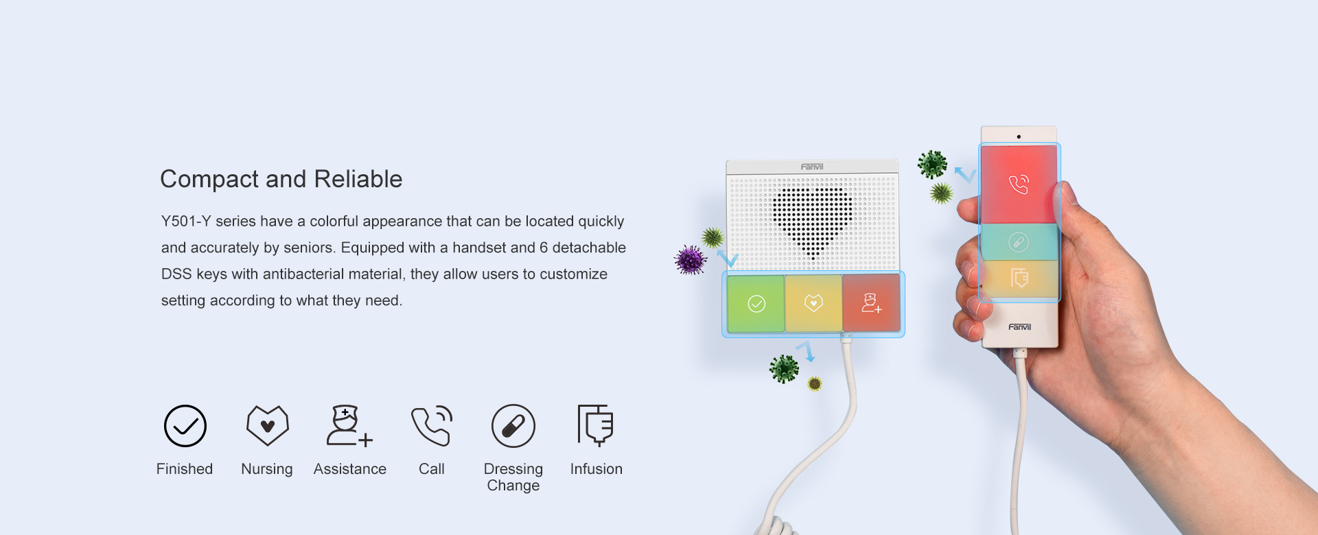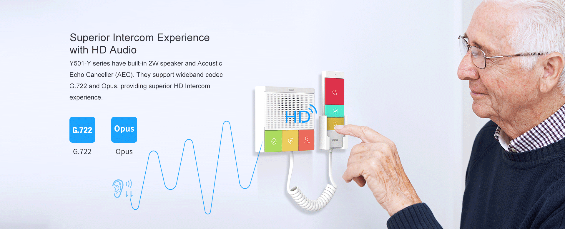 Los intercomunicadores SIP para el cuidado de la salud de la serie Fanvil Y501-Y están especialmente diseñados para la atención domiciliaria, la residencia de ancianos y otras aplicaciones en interiores, realizando la comunicación de emergencia, la protección de seguridad, la transmisión, etc. Cuentan con audio HD, 2 cuentas SIP, teclas DSS desmontables, IP54 resistente al agua y al polvo, y Wi-Fi 2.4G y 5G incorporado (Y501W-Y / Y501W-Y-E). La serie Y501-Y proporciona diferentes modos de instalación de caja estándar 86 integrada y montable en la pared, lo que le brinda una experiencia de comunicación de atención médica oportuna.