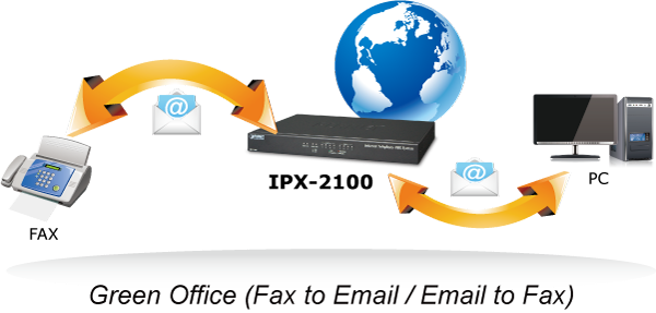 El servicio de fax a correo electrónico/correo electrónico a fax proporcionado por el IPX-2100 permite a los usuarios transferir y recibir faxes directamente hacia o desde su bandeja de entrada de correo electrónico como archivos adjuntos. Es una forma fácil y confidencial de recibir, almacenar y reenviar documentos de fax importantes, creando así una oficina verde sin papel.