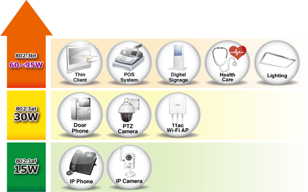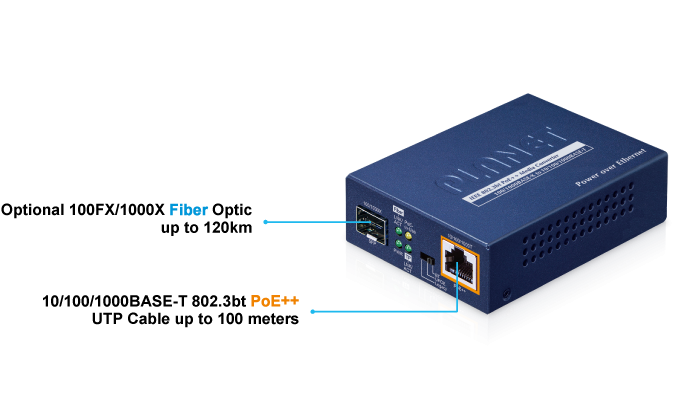 Como PLANET GUP-805A-95W adopta la tecnología estándar IEEE 802.bt PoE++, es capaz de suministrar hasta 95 vatios de energía mediante el uso de los cuatro pares de cableado Ethernet Cat5e/6 estándar para suministrar energía y datos a máxima velocidad a cada dispositivo alimentado (PD) compatible con PoE remoto. Su capacidad de potencia es tres veces mayor que la del PoE+ 802.3at convencional y es una solución ideal para los dispositivos de red que consumen mucha energía, como: