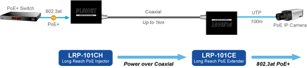 • LRP-101CE: 1 puerto 10/100TX PoE PSE + 1 puerto coaxial extensor PoE de largo alcance