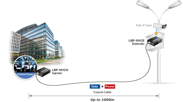Un cable UTP normal solo se puede extender hasta 100 metros, pero el LRP-101C-KIT puede extender la red PoE hasta 1000 metros (3280 pies) a través de un cable coaxial existente de 75 ohmios con transmisión de video estable y de alta calidad. Elimina la necesidad de energía adicional del sitio remoto mientras permite que una sola fuente de energía proporcione energía a los extensores LRP y a la cámara IP PoE a larga distancia.