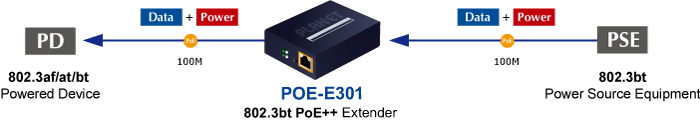 No importa cuántos dispositivos de red compatibles con PoE, como cámaras IP PoE, puntos de acceso inalámbricos PoE y teléfonos IP PoE, se implementen, se instalan fácilmente sin la necesidad de tener una toma de corriente adicional. Sin embargo, debido a la limitación del cableado UTP, solo se utilizan hasta 100 metros (328 pies) de cable. Por lo tanto, el POE-E301 está diseñado como el extensor para transmitir datos Gigabit Ethernet y alimentación PoE++ 802.3bt a otra distancia de 100 m. Al conectar en cadena varios POE-E301, la distancia se puede triplicar o cuadriplicar para satisfacer sus necesidades.