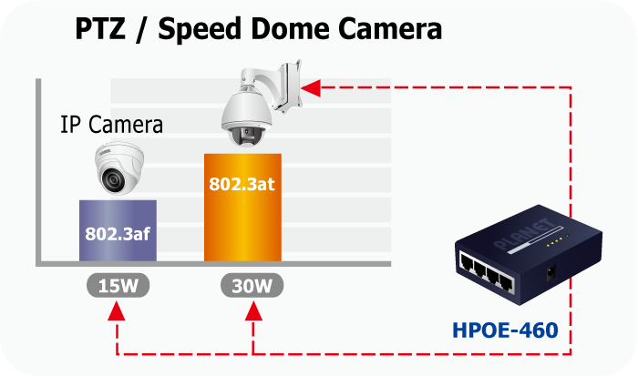 PLANET HPOE-460 es un concentrador inyector PoE+ IEEE 802.3at Gigabit de 4 puertos, que ofrece alimentación por Ethernet Plus (PoE+) IEEE 802.3af e IEEE 802.3at que ofrece hasta 30 vatios de potencia de salida y datos por puerto a través de un cable Ethernet Cat 5e/6. Está diseñado específicamente para satisfacer la demanda de dispositivos alimentados por red que consumen más energía, como cámaras de red PTZ (pan, tilt, zoom)/domo de velocidad, puntos de acceso LAN inalámbricos multicanal (802.11ac/b/g/n/a) y otros dispositivos de red, al proporcionar el doble de potencia PoE, más que el PSE PoE 802.3af convencional.