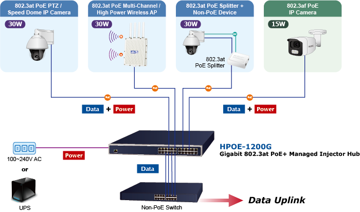 Con datos y alimentación a través de Ethernet desde una unidad, el HPOE-1200G puede reducir la instalación de cables de alimentación y eliminar la necesidad de tomas de corriente dedicadas en la pared, el techo o cualquier lugar inaccesible.