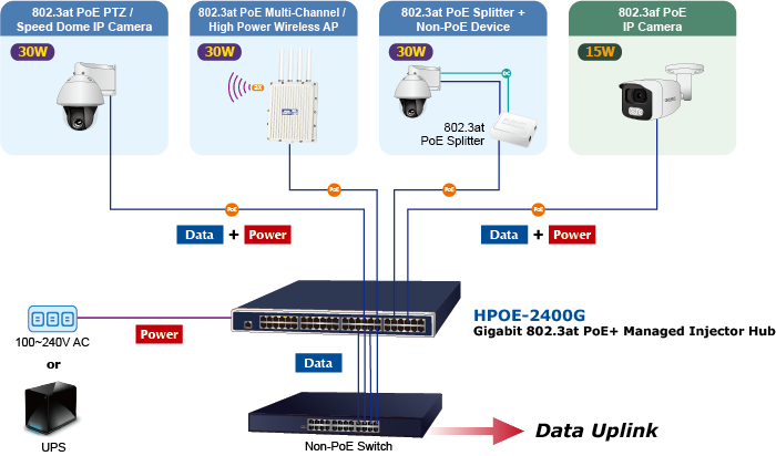 Con datos y alimentación a través de Ethernet desde una sola unidad, el HPOE-2400G puede reducir la instalación de cables de alimentación y eliminar la necesidad de tomas de corriente dedicadas en la pared, el techo o cualquier lugar inaccesible.
