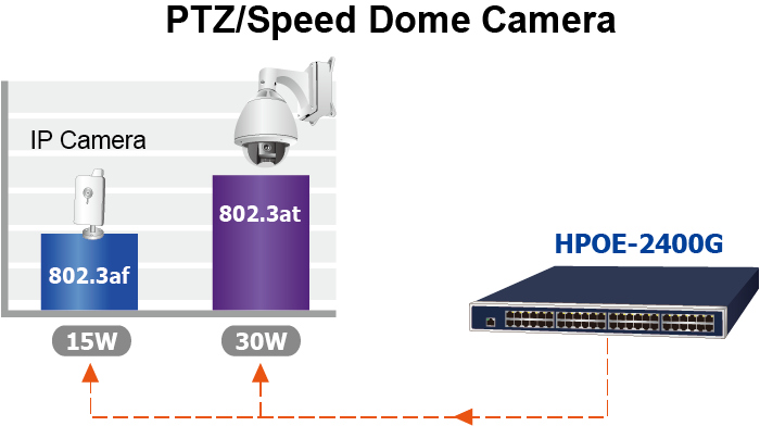 La alimentación en línea PoE que adopta el estándar IEEE 802.3at Power over Ethernet Plus permite que el HPOE-2400G pueda suministrar por puerto hasta 36 vatios de potencia a cada dispositivo de red compatible con PoE remoto. Posee el doble de capacidad de potencia que el PoE 802.3af convencional y es una solución ideal para satisfacer la creciente demanda de dispositivos de red que consumen más energía, como PTZ (pan, tilt y zoom), cámaras de red domo de velocidad, teléfonos de pantalla táctil a color o de video y voz sobre IP (VoIP), puntos de acceso LAN inalámbricos 802.11ac multicanal y otros dispositivos de red.