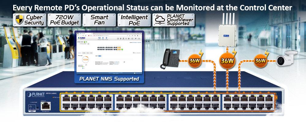 Los productos PoE administrados de PLANET adoptan no solo la tecnología Power over Ethernet, sino también la supervisión automatizada de PD y el estado PoE en tiempo real. El HPOE-2400G se puede configurar para monitorear el estado de los PD conectados en tiempo real a través de la acción de ping a través del conmutador Ethernet de enlace ascendente. Una vez que el PD deja de funcionar y responder, el HPOE-2400G reciclará la energía del puerto PoE y hará que el PD vuelva a funcionar. También mejorará en gran medida la confiabilidad de la red, ya que el puerto PoE restablecerá la energía del PD, lo que reducirá la carga de administración del administrador.