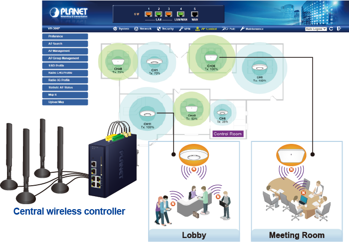 El ICG-2515F-NR proporciona una administración centralizada de la serie PLANET Smart AP a través de una interfaz gráfica de usuario web fácil de usar. Es fácil configurar el AP para la SSID inalámbrica, la banda de radio y las configuraciones de seguridad. Con un proceso de configuración de cuatro pasos, los perfiles inalámbricos para diferentes propósitos se pueden entregar simultáneamente a múltiples AP o grupos de AP para minimizar el tiempo, el esfuerzo y el costo de implementación.
