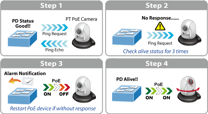 El VR-300P se puede configurar para supervisar el estado del PD conectado en tiempo real mediante una acción de ping. Una vez que el PD deja de funcionar y responder, el VR-300P reanudará la alimentación del puerto PoE y hará que el PD vuelva a funcionar. Esto mejorará en gran medida la confiabilidad de la red a través del puerto PoE que restablece la fuente de alimentación del PD y reduce la carga de administración del administrador.