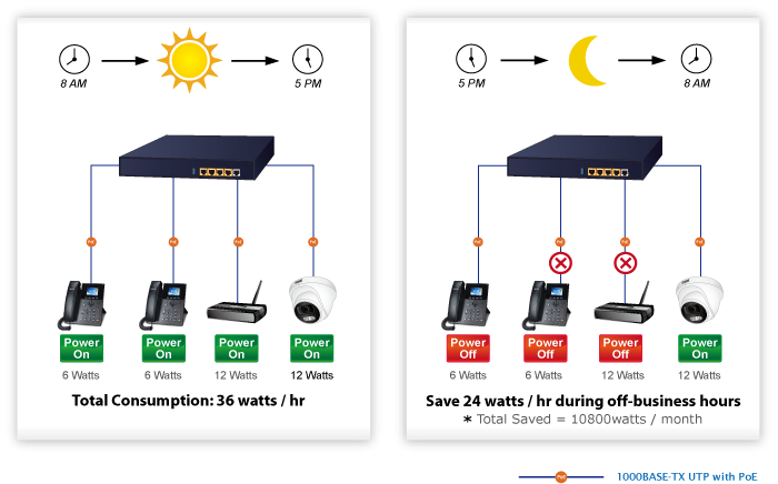 De acuerdo con la tendencia mundial de ahorro de energía y la contribución a la protección del medio ambiente, el VR-300P puede controlar eficazmente la fuente de alimentación, además de su capacidad de proporcionar una alta potencia en vatios. La función de "programación de PoE" le ayuda a habilitar o deshabilitar la alimentación de energía PoE para cada puerto PoE durante intervalos de tiempo específicos y es una función poderosa para ayudar a las PYMES o empresas a ahorrar energía y presupuesto. También aumenta la seguridad al apagar los PD que no deberían estar en uso durante las horas no laborales.