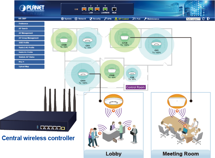 El VR-300FW-NR proporciona una gestión centralizada de la serie PLANET Smart AP a través de una interfaz gráfica de usuario web fácil de usar. Es fácil configurar el punto de acceso para la SSID inalámbrica, la banda de radio y los ajustes de seguridad. Con un proceso de configuración de cuatro pasos, se pueden entregar simultáneamente diferentes propósitos de perfiles inalámbricos a varios puntos de acceso o grupos de puntos de acceso para minimizar el tiempo, el esfuerzo y el costo de implementación.