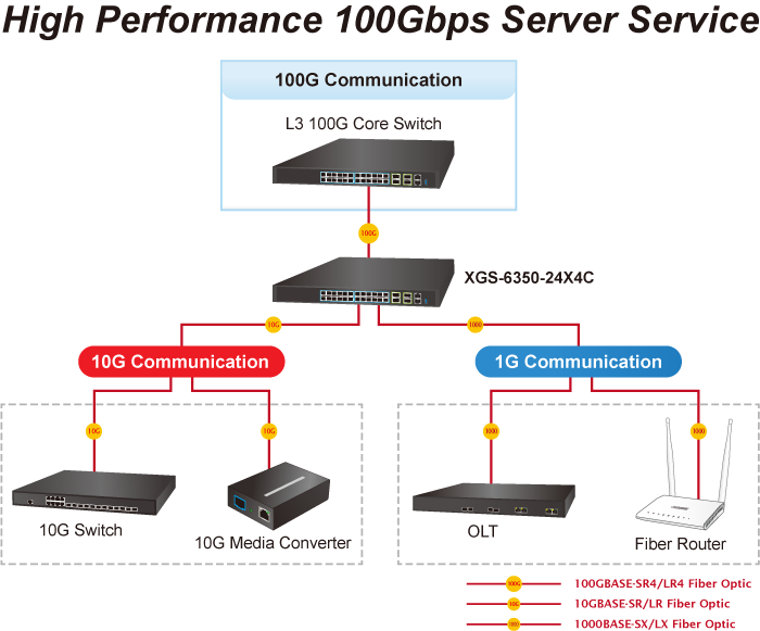 El XGS-6350-24X4C proporciona veinticuatro interfaces SFP+ de 10 Gbps y cuatro interfaces de fibra QSFP28 de 100 Gbps. Cada una de las ranuras SFP+ admite doble velocidad, 10GBASE-SR/LR o 1000BASE-SX/LX y cada una de las ranuras QSFP28 admite modos nativos de 100 Gigabit Ethernet, 40G y 4 x 10 Gigabit Ethernet. Por lo tanto, el administrador puede elegir de forma flexible el transceptor SFP adecuado no solo en función de la distancia de transmisión, sino también de la velocidad de transmisión requerida. La distancia se puede ampliar de 550 metros a 2 km (fibra multimodo) o hasta 10/20/30/40/50/70/120 km (fibra monomodo o fibra WDM). Son muy adecuados para aplicaciones dentro de los centros de datos y distribuciones empresariales.