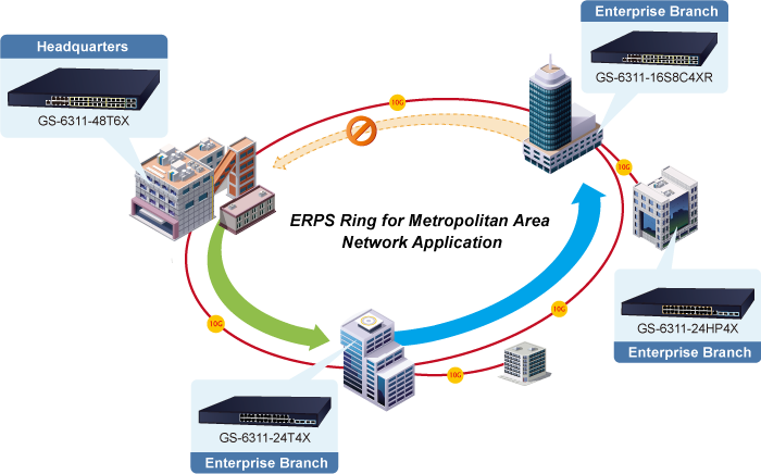 El GS-6311-48P6X admite la tecnología de anillo redundante y presenta una capacidad de autorrecuperación rápida y sólida para evitar interrupciones e intrusiones externas. Incorpora tecnología avanzada ITU-T G.8032 ERPS (Ethernet Ring Protection Switching) y protocolo Spanning Tree (802.1s MSTP) en la red del cliente para mejorar la confiabilidad del sistema y el tiempo de funcionamiento en entornos hostiles. En una determinada red de anillo simple, el tiempo de recuperación podría ser inferior a 10 ms para que la red vuelva rápidamente a funcionar con normalidad.