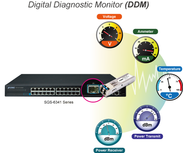 El SGS-6341-24P4X admite la función SFP-DDM (monitor de diagnóstico digital) que ayuda en gran medida al administrador de red a monitorear fácilmente los parámetros en tiempo real de los transceptores SFP y SFP+, como la potencia de salida óptica, la potencia de entrada óptica, la temperatura, la corriente de polarización del láser y el voltaje de suministro del transceptor.