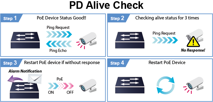 El El GS-4210-16UP8T4X se puede configurar para supervisar el estado del dispositivo de almacenamiento conectado en tiempo real mediante una acción de ping. Una vez que el dispositivo de almacenamiento deja de funcionar y de responder, el GS-4210-16UP8T4X reanudará la alimentación del puerto PoE y hará que el dispositivo de almacenamiento vuelva a funcionar. Esto mejorará en gran medida la fiabilidad de la red mediante el restablecimiento de la fuente de alimentación del dispositivo de almacenamiento a través del puerto PoE y reducirá la carga de gestión del administrador.