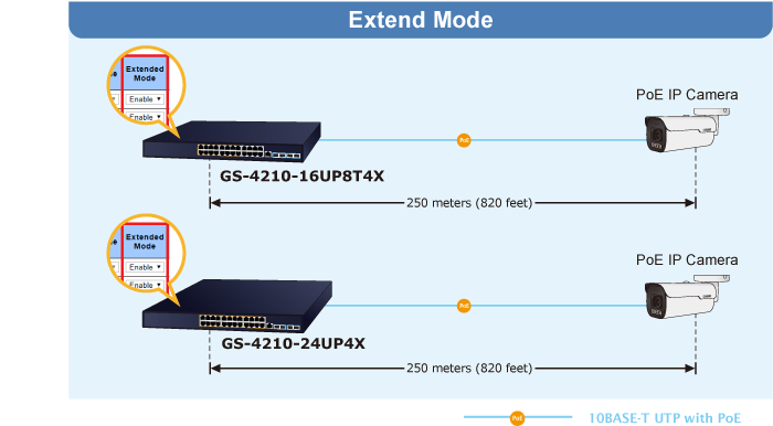 En el modo de funcionamiento "Extendido", el GS-4210-16UP8T4X funciona por puerto a una velocidad dúplex de 10 Mbps, pero puede admitir una salida de alimentación PoE de 50 vatios a una distancia de hasta 250 metros, superando el límite de 100 m del cable UTP Ethernet. Con esta nueva función, el GS-4210-16UP8T4X proporciona una solución adicional para la extensión de la distancia PoE 802.3at/af, ahorrando así el coste de la instalación del cable Ethernet.