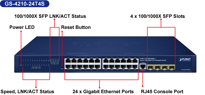 Los GS-4210-24T4S y GS-4210-24T4SR de PLANET son los switches Gigabit ideales que ofrecen una ventaja rentable para las redes de área local y son ampliamente aceptados en la red de oficinas de PYMES. Ofrecen funciones inteligentes de conmutación y gestión de paquetes de datos L2/L4, una interfaz de usuario web fácil de usar y un funcionamiento estable. Además de la popular gestión de IPv6/IPv4 y las abundantes funciones de conmutación L2/L4, los GS-4210-24T4S y GS-4210-24T4SR cuentan con una función sin ventilador y tecnología ecológica para proporcionar un entorno de red de oficina silencioso, de ahorro de energía, de alta velocidad y confiable.