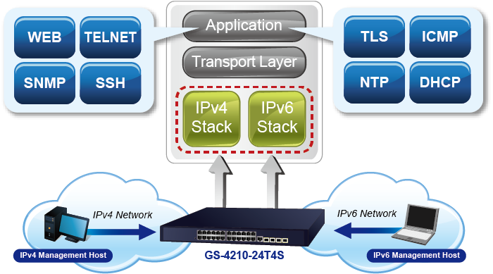 Al ser compatibles con los protocolos IPv6 e IPv4, el GS-4210-24T4S y el GS-4210-24T4SR ayudan a las PYMES a dar el salto a la era IPv6 con la menor inversión, ya que no es necesario reemplazar ni revisar sus instalaciones de red si se configura la red de borde FTTx IPv6.