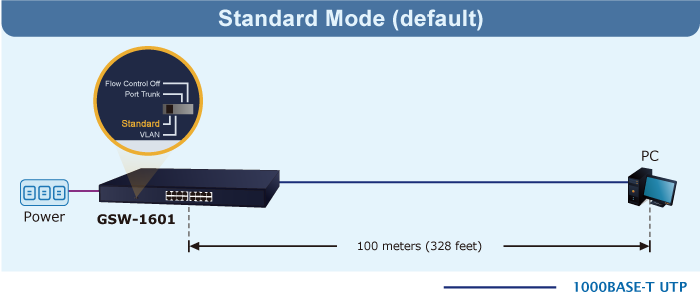 El GSW-1601 funciona como un conmutador Gigabit Ethernet normal en el modo de funcionamiento "Estándar". El modo de funcionamiento "VLAN" cuenta con una función VLAN basada en puerto que puede ayudar a evitar que la tormenta de difusión o multidifusión de los clientes conectados se influencie entre sí.