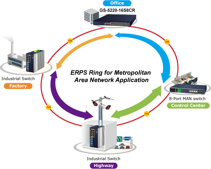 El GS-5220-16S8CR admite la tecnología de anillo redundante y cuenta con una capacidad de autorrecuperación rápida y sólida para evitar interrupciones e intrusiones externas. Incorpora la tecnología avanzada ITU-T G.8032 ERPS (Ethernet Ring Protection Switching) y el protocolo Spanning Tree (802.1s MSTP) en la red del cliente para mejorar la confiabilidad del sistema y el tiempo de funcionamiento en entornos hostiles.
