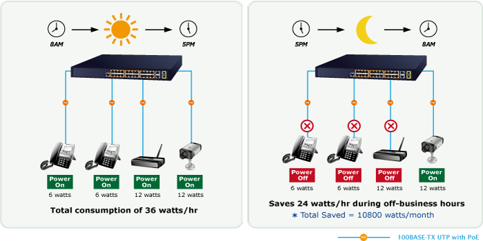 Además de utilizarse para vigilancia IP, el FGSW-2624HPS4 es ciertamente aplicable para construir cualquier red PoE, incluidas VoIP y LAN inalámbrica. En el marco de la tendencia mundial de ahorro de energía y de contribución a la protección del medio ambiente en la Tierra, el FGSW-2624HPS4 puede controlar eficazmente la fuente de alimentación, además de su capacidad de proporcionar una gran potencia en vatios. La función de “programación PoE” le ayuda a habilitar o deshabilitar la alimentación de energía PoE para cada puerto PoE durante intervalos de tiempo específicos y es una función poderosa para ayudar a las PYMES y empresas a ahorrar energía y presupuesto.