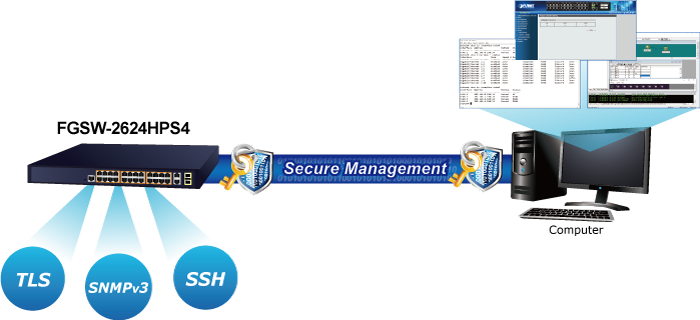 Para una administración eficiente, el FGSW-2624HPS4 está equipado con interfaces de administración web, Telnet y SNMP. Con la interfaz de administración basada en web incorporada, el FGSW-2624HPS4 ofrece una función de administración y configuración fácil de usar e independiente de la plataforma. Al admitir el Protocolo simple de administración de red (SNMP) estándar, el FGSW-2624HPS4 se puede administrar a través de cualquier software de administración estándar. Para la administración basada en texto, se puede acceder al conmutador a través de Telnet. Además, el FGSW-2624HPS4 ofrece una gestión remota segura al admitir conexiones SNMPv3 que cifran el contenido de los paquetes en cada sesión.