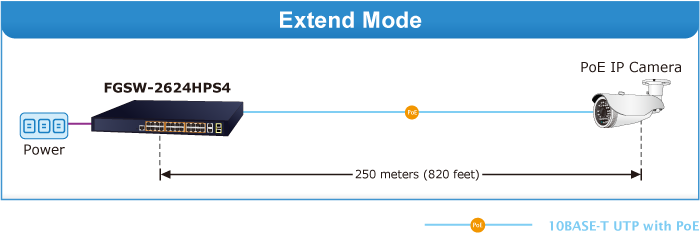 En el modo de operación “Extendido”, el FGSW-2624HPS4 funciona por puerto a una velocidad de funcionamiento dúplex de 10 Mbps, pero puede admitir la salida de energía PoE a una distancia de hasta 250 metros, superando el límite de 100 metros del cable UTP Ethernet.