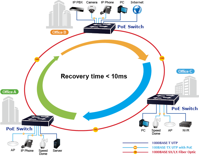 El GS-4210-16P4C admite la tecnología de anillo redundante y cuenta con una capacidad de autorrecuperación rápida y sólida para evitar interrupciones e intrusiones externas. Incorpora tecnología avanzada ITU-T G.8032 ERPS (Ethernet Ring Protection Switching), protocolo Spanning Tree (802.1s MSTP) en la red del cliente para mejorar la confiabilidad y el tiempo de actividad del sistema en varios entornos.