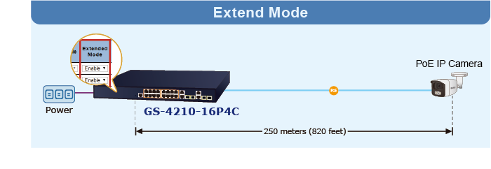 En el modo de operación "Extend", el GS-4210-16P4C opera por puerto a una velocidad de funcionamiento dúplex de 10 Mbps, pero puede admitir una salida de energía PoE de 30 vatios a una distancia de hasta 250 metros, superando el límite de 100 m del cable UTP Ethernet. Con esta nueva característica, el GS-4210-16P4C proporciona una solución adicional para la extensión de la distancia PoE 802.3at/af, ahorrando así el costo de la instalación del cable Ethernet.
