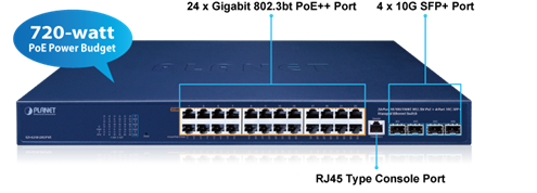 El switch administrado Gigabit 802.3bt PoE++ PLANET GS-4210-24UP4X cuenta con funciones PoE inteligentes PLANET para mejorar la disponibilidad de aplicaciones empresariales críticas. Proporciona administración de doble pila IPv6/IPv4 y un motor de conmutación Gigabit L2/L4 integrado. El GS-4210-24UP4X viene con 24 puertos 10/100/1000BASE-T 802.3bt PoE++ y 4 puertos de fibra de 10 Gigabit, con un presupuesto de energía total de 720 vatios. El GS-4210-24UP4X ofrece una solución de red 802.3bt PoE++ rápida, segura y rentable para pequeñas empresas y grandes empresas.