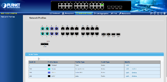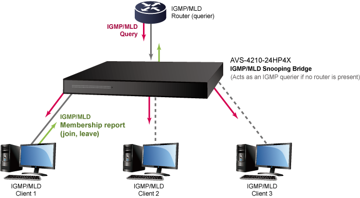 El AVS-4210-24HP4X se puede programar para funciones avanzadas de administración de conmutadores, como agregación de enlaces de puertos dinámicos, VLAN 802.1Q y VLAN Q-in-Q, protocolo de árbol de expansión múltiple (MSTP), protección de bucle y BPDU, vigilancia IGMP y vigilancia MLD. A través de la agregación de enlaces, el AVS-4210-24HP4X permite la operación de un enlace troncal de alta velocidad para combinarlo con varios puertos y también admite conmutación por error. Además, el protocolo de descubrimiento de capa de enlace (LLDP) es el protocolo de capa 2 incluido para ayudar a descubrir información básica sobre los dispositivos vecinos en el dominio de transmisión local.