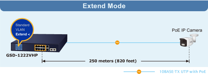 En el modo de funcionamiento Extendido, el GSD-1222VHP funciona por puerto a una velocidad de funcionamiento dúplex de 10 Mbps, pero puede soportar una potencia de salida PoE de 30 vatios a una distancia de hasta 250 metros, superando el límite de 100 m del cable UTP Ethernet. Con esta nueva característica, el GSD-1222VHP proporciona una solución adicional para la extensión de la distancia PoE 802.3at/af, ahorrando así el coste de la instalación del cable Ethernet. Su función de aislamiento VLAN aísla los puertos para evitar tormentas de difusión y defenderse de la suplantación de DHCP en el modo de funcionamiento Extendido.