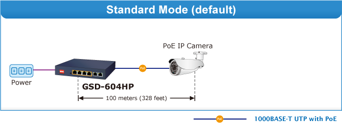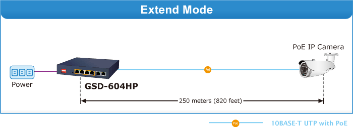 En el modo de funcionamiento extendido, el GSD-604HP funciona por puerto a una velocidad dúplex de 10 Mbps, pero puede admitir una salida de potencia PoE de 20 vatios a una distancia de hasta 250 metros, superando el límite de 100 m del cable UTP Ethernet. Con esta nueva función, el GSD-604HP ofrece una solución adicional para la extensión de la distancia PoE 802.3at/af, ahorrando así el coste de la instalación del cable Ethernet. Su función de aislamiento VLAN aísla los puertos para evitar la tormenta de difusión y defenderse de la suplantación de DHCP en el modo de funcionamiento extendido.
