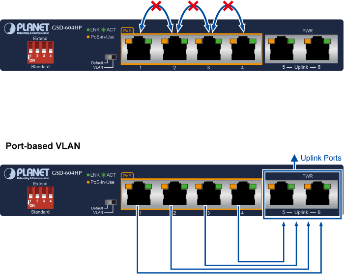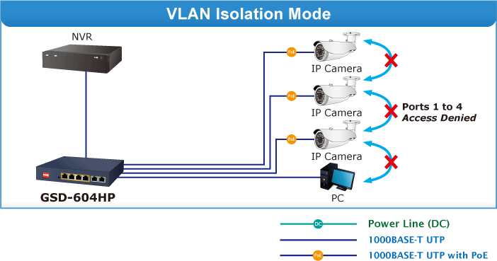 El GSD-604HP cuenta con una "VLAN basada en puerto" cuyos puertos se pueden aislar entre sí a través de un interruptor DIP. Esto puede ayudar a evitar que la tormenta de multidifusión o difusión de la cámara IP se influya entre sí, cumpliendo así con los requisitos de los sistemas de vigilancia IP y los proyectos Ethernet.