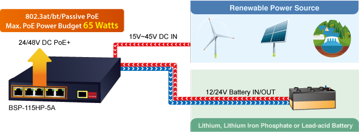 La batería de litio, plomo-ácido o hierro-litio de 12 V/24 V se recarga a través del BSP-115HP-5A, que se alimenta de energía solar. Por lo tanto, el BSP-115HP-5A seguirá alimentando un punto de acceso PoE inalámbrico como un dispositivo de almacenamiento en red sin un cable y una cámara con cable conectada a su puerto con un cable UTP. Su característica de cero emisiones de carbono es posible porque la energía que recibe la unidad es renovable. Lo más importante es que el funcionamiento de la vigilancia inalámbrica basada en IP al aire libre puede continuar durante la noche, ya que la batería se carga durante el día.