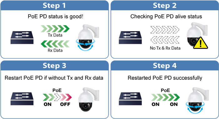 La serie BSP-115 puede monitorear el estado del PD conectado en tiempo real a través de la función de verificación de actividad del PD. Una vez que el PD deja de funcionar y responder, la serie BSP-115 reanudará la alimentación PoE y hará que el PD vuelva a funcionar. Mejorará en gran medida la confiabilidad de la red a través del puerto PoE que restablece la fuente de alimentación del PD y reduce la carga de administración del administrador.