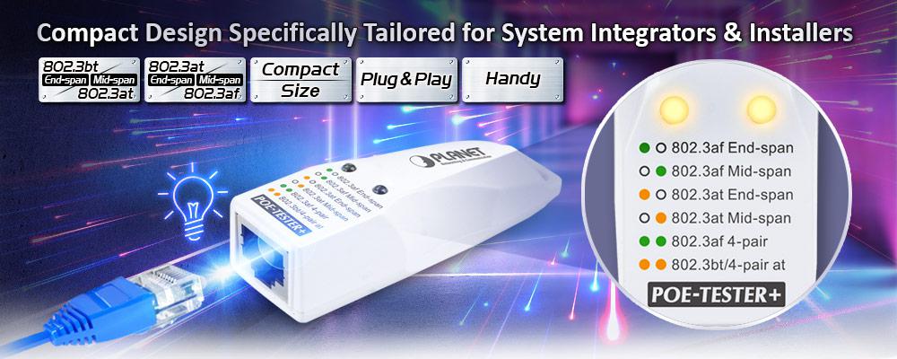 PLANET POE-TESTER+ es un adaptador de diagnóstico PoE de nueva generación y fácil de usar para instaladores de red, integradores de sistemas, MIS de empresas e incluso usuarios domésticos para identificar rápidamente la existencia de Power over Ethernet en la red de aplicaciones. Está diseñado para detectar si el voltaje PoE IEEE 802.3af/at/bt pasa por el cable UTP e identificar el tipo de PSE (equipo de fuente de alimentación) para solucionar problemas.